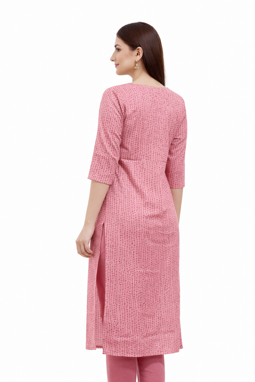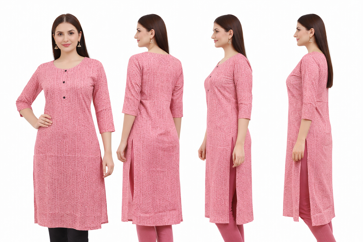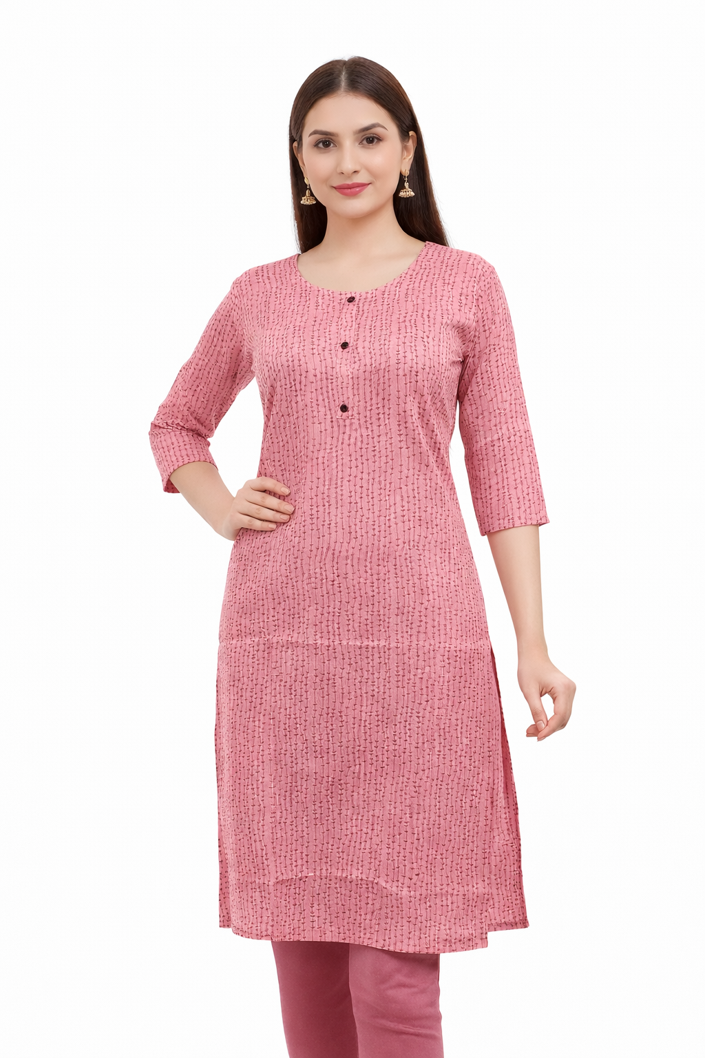 Designed in a straight fit silhouette, this kurti offers a flattering shape that suits different body types. The straight cut ensures a comfortable and relaxed fit without compromising on style. The length of the kurti is ideal for daily use, giving a neat and elegant appearance whether worn at home or outside. The round neckline is complemented with elegant button detailing on the front, adding a subtle yet stylish highlight to the design. The buttons not only enhance the look but also add a touch of sophistication to the kurti.